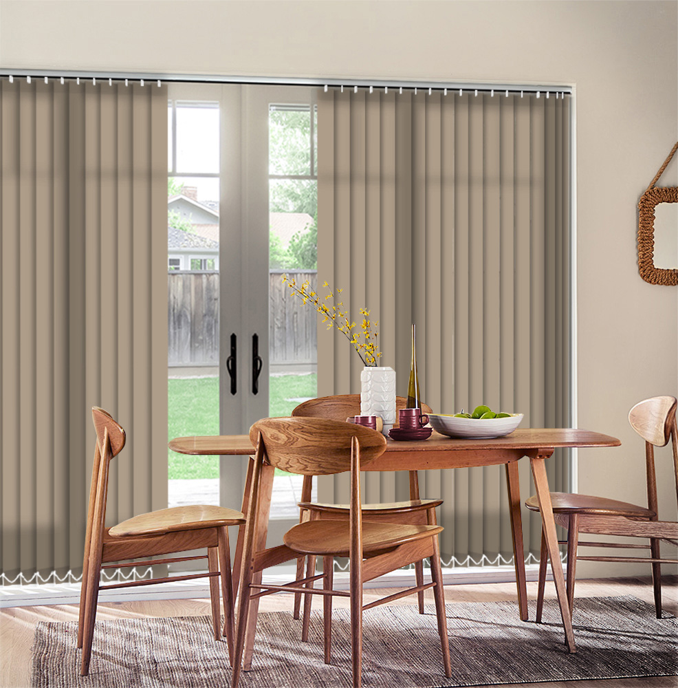 Hessian brown is a plain dim out vertical blind fabric made to measure to your window size and available in an 89mm slat width.