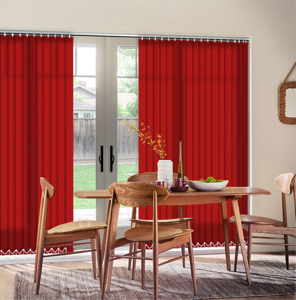 A stunning dim out scarlett red vertical blind made to your specifications. Manufactured with an 89mm louvre, comes with all fixtures & fittings direct from the UK factory.